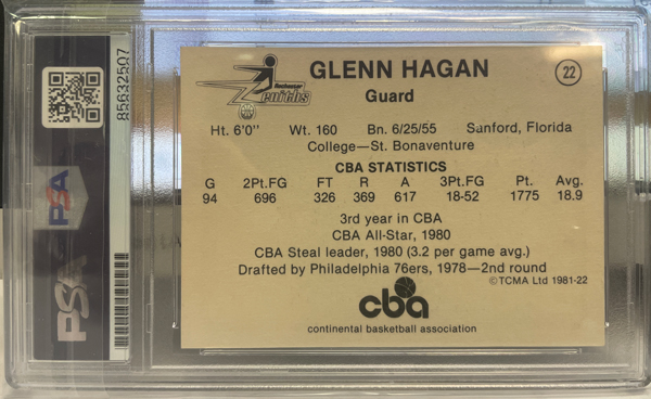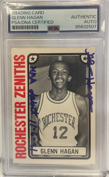 This Glenn Hagan card is from his days in the Continental Basketbal Association's Rochester Zenith's. It is signed and dated for the date that Hagan entered the National Basketall Association in 1981. The autograph is authenticated.