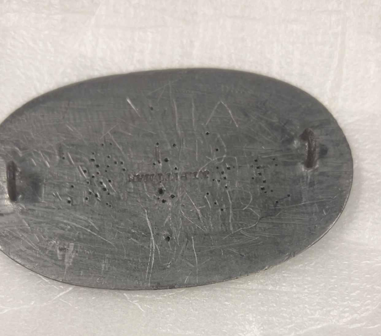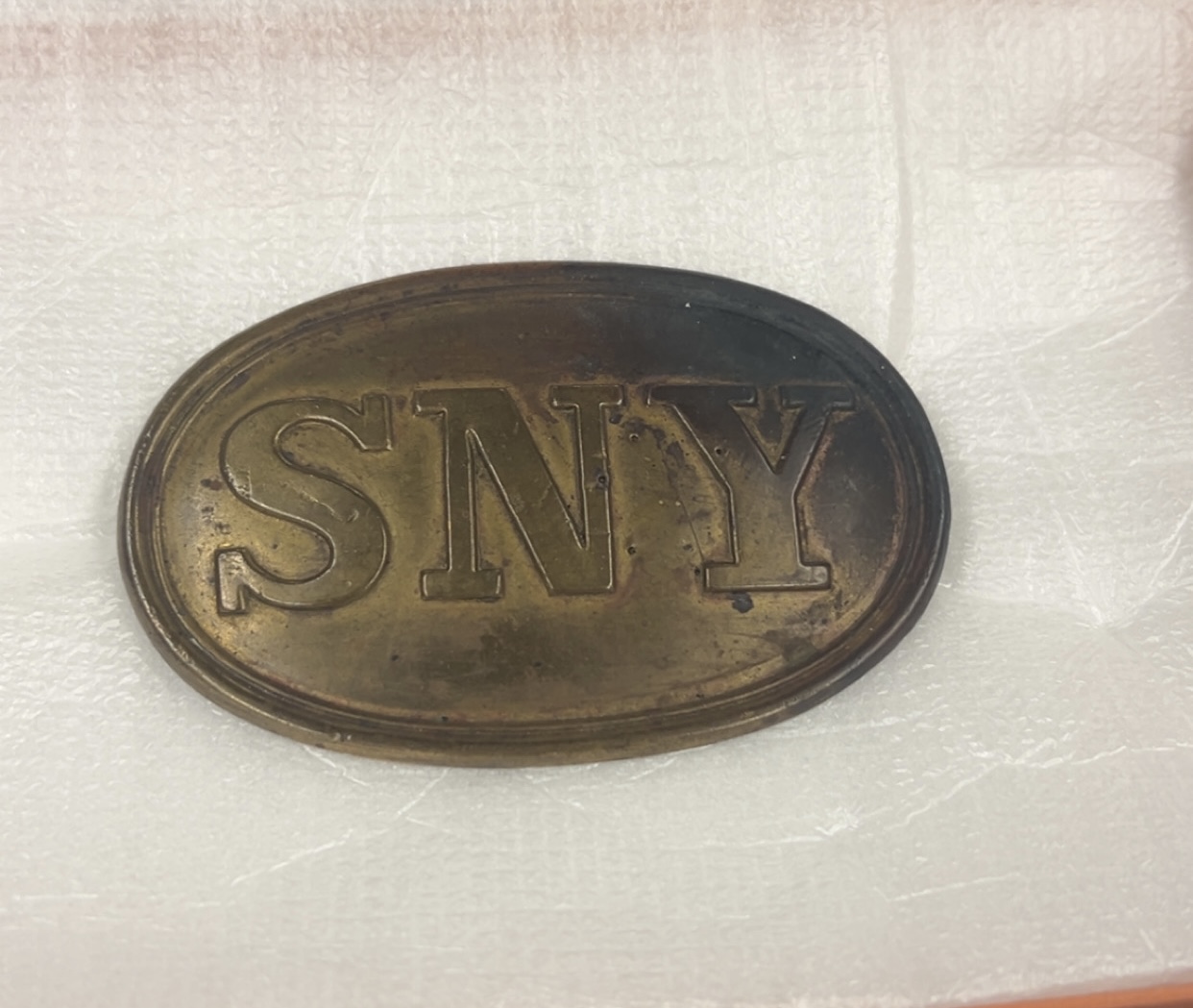 On the front are the raised letters, SNY, meaning State of New York. There is also a burn mark on the top right, reaching onto the Y.